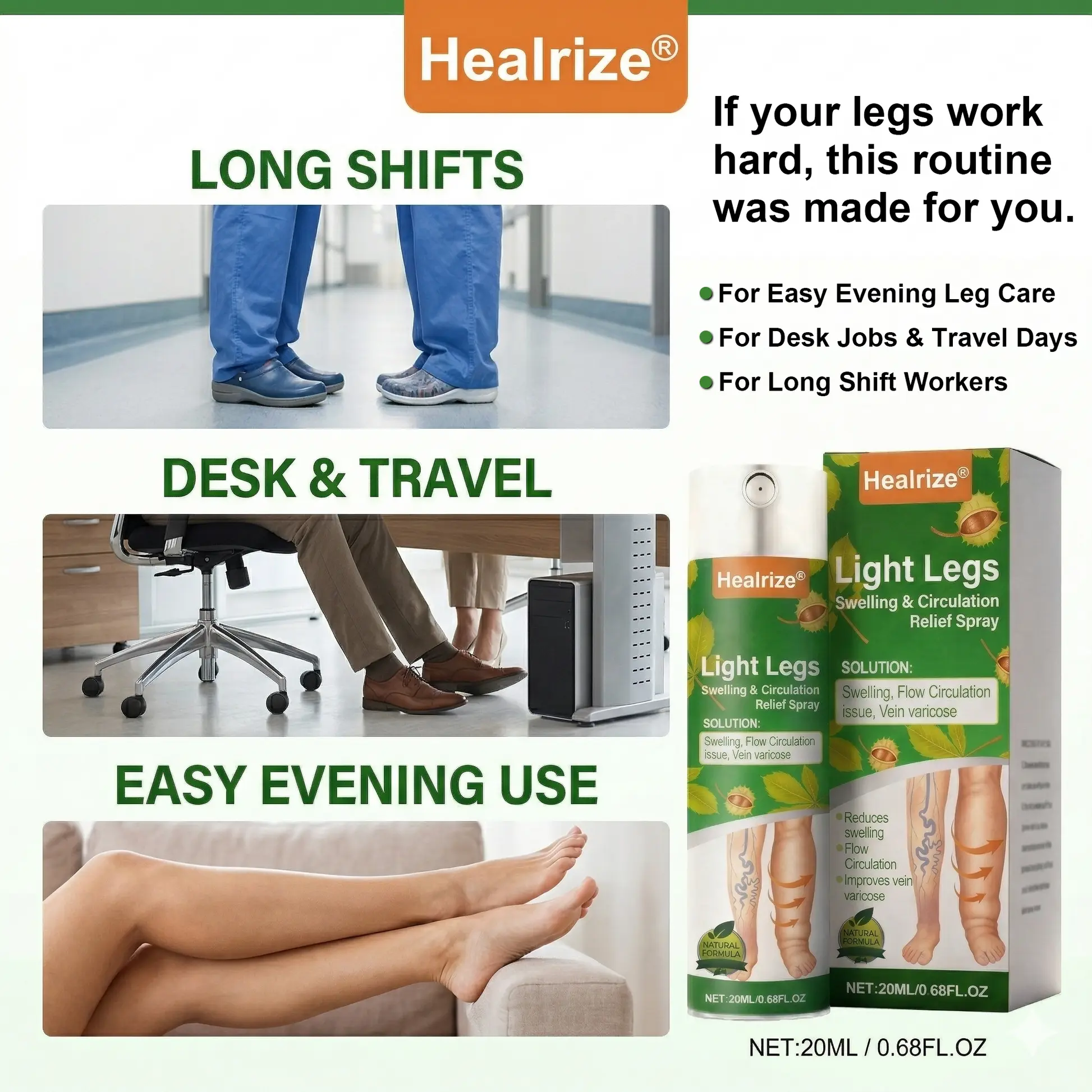 Healrize® Light Legs Swelling & Circulation Relief Spray is a fast-drying daily mist made for legs that feel heavy, tight, puffy, or overworked after long hours of standing, sitting, walking, or nonstop movement.