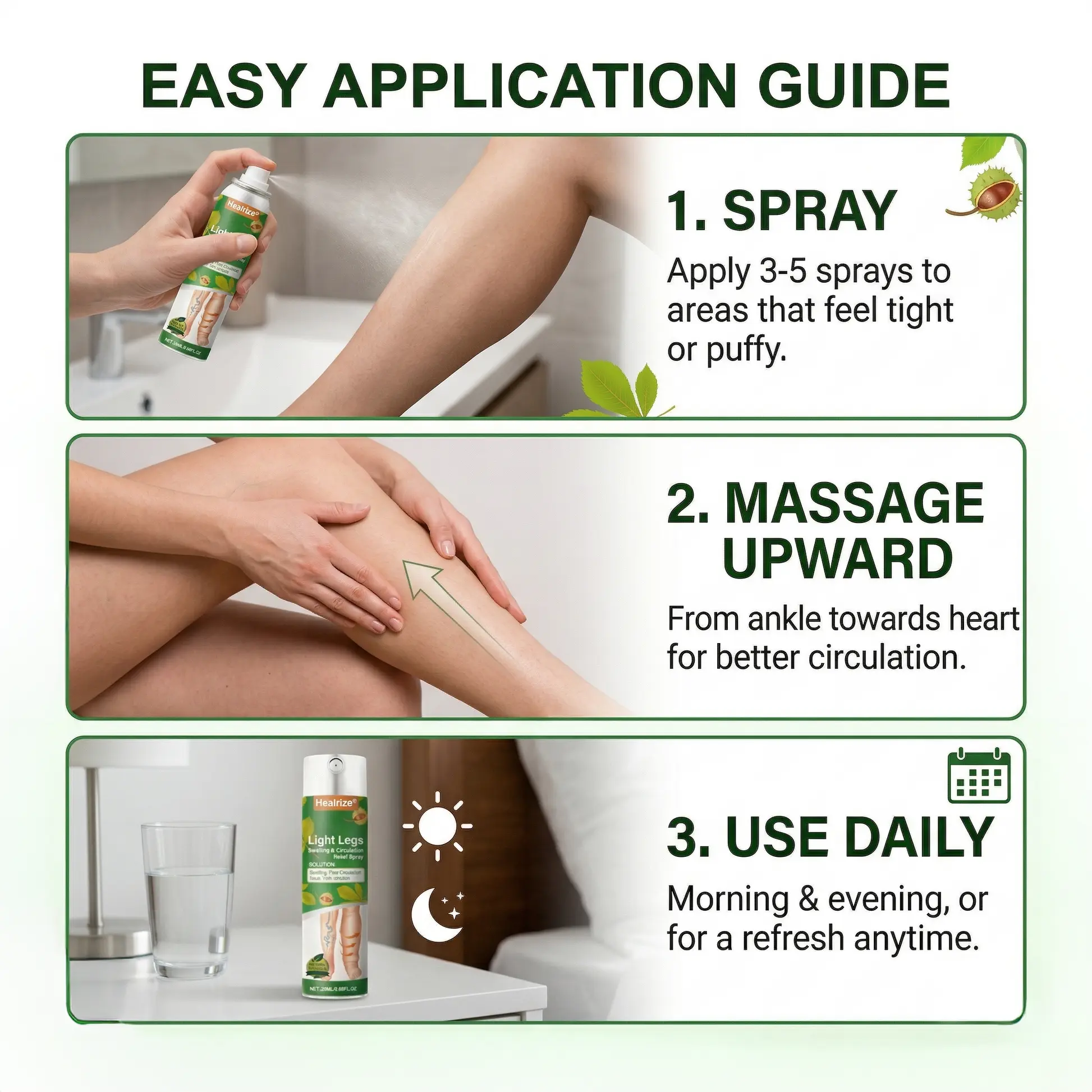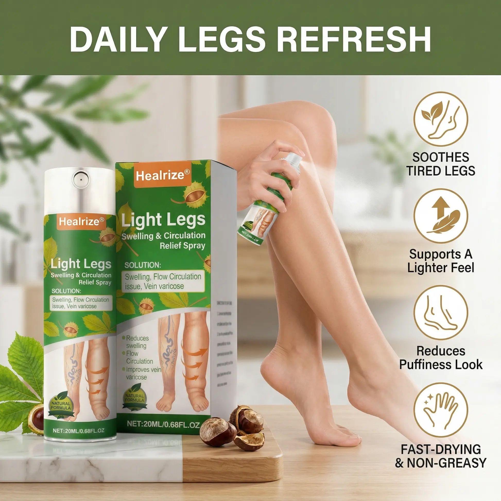 Healrize® Light Legs Swelling & Circulation Relief Spray was built around one goal: give your legs a daily reset that feels fast, light, and easy enough to actually stick with.