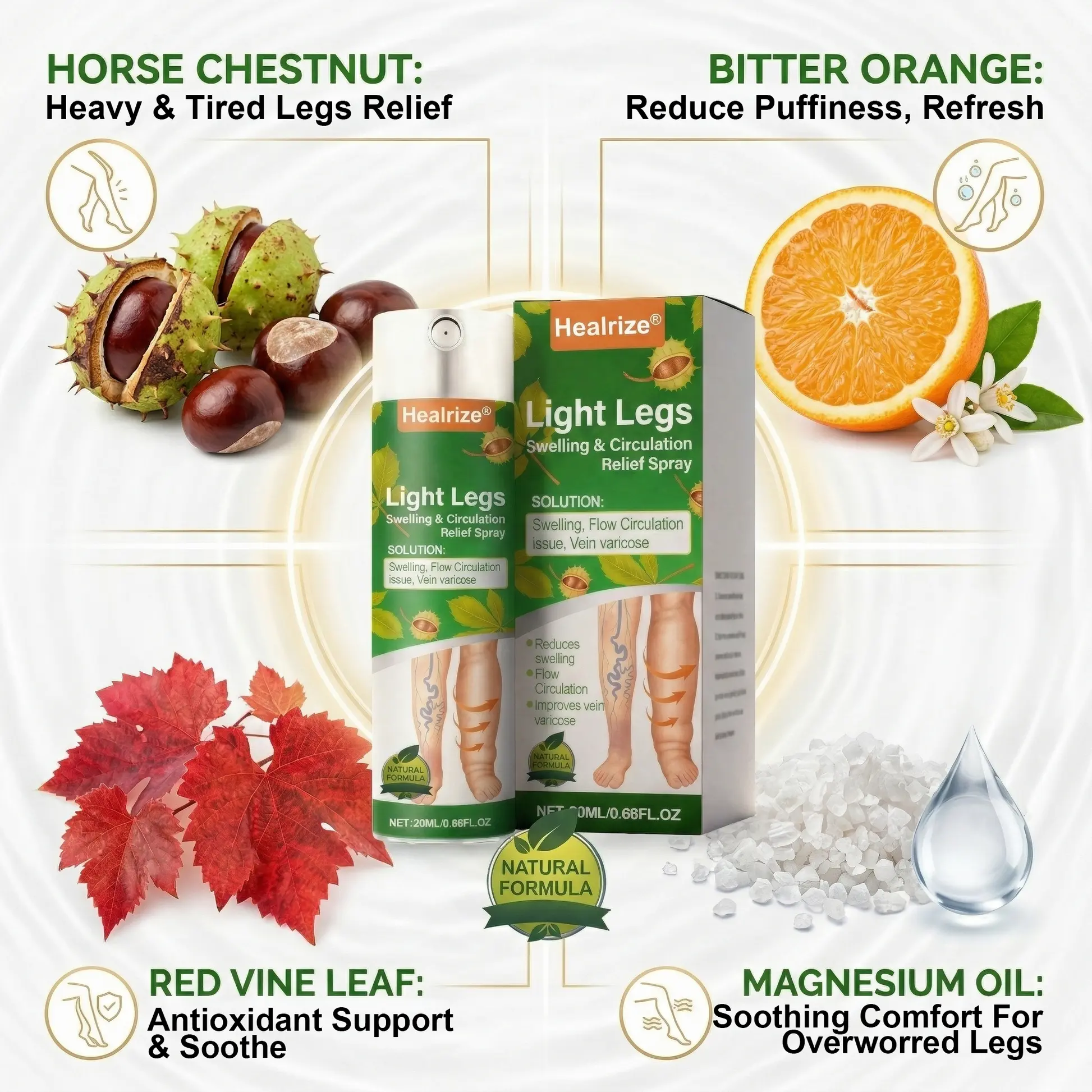 Each ingredient in Healrize® Light Legs Swelling & Circulation Relief Spray was chosen to support comfort, freshness, and a lighter-feeling daily leg routine.
